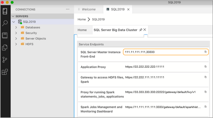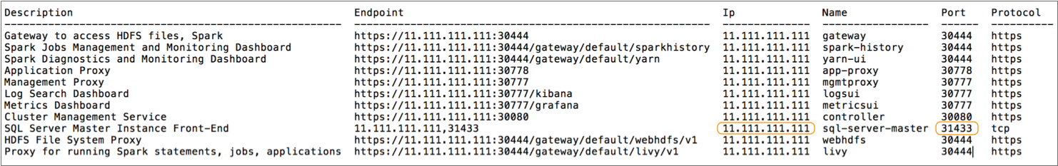 You can retrieve the SQL Server master instance IP address and port number using the command line or using a client application such as Azure Data Studio. For information about using the command line, see the SQL Server 2019 BDC documentation.